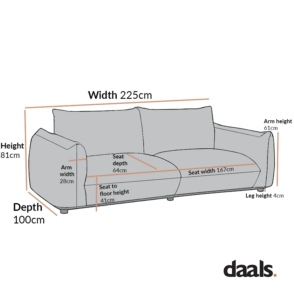- Three seater sofa size: W 225  x D 101 x H 81 cm.Â